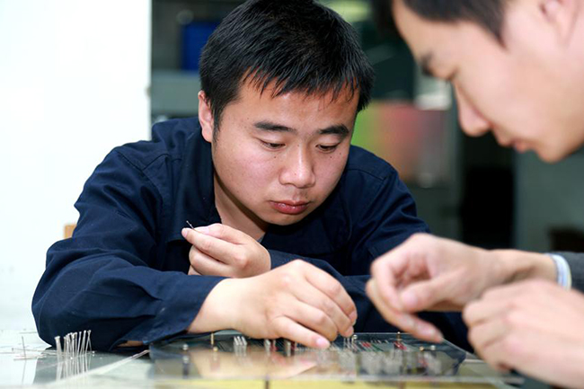 精密電路事業(yè)部肖楠和韓悅在為38所某項(xiàng)目板子制作電測(cè)模架