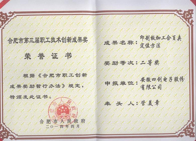 五一勞動(dòng)節(jié)前夕,合肥市政府和合肥市總工會(huì)傳來喜訊,在合肥市第三屆職工技術(shù)創(chuàng)新成果獎(jiǎng)評選中,四創(chuàng)電子公司的《印制板加工合頁夾定位方法》項(xiàng)目獲職工技術(shù)創(chuàng)新成果二等獎(jiǎng);同時(shí),管美章同志獲“合肥市金牌職工”榮譽(yù)稱號(hào)。
